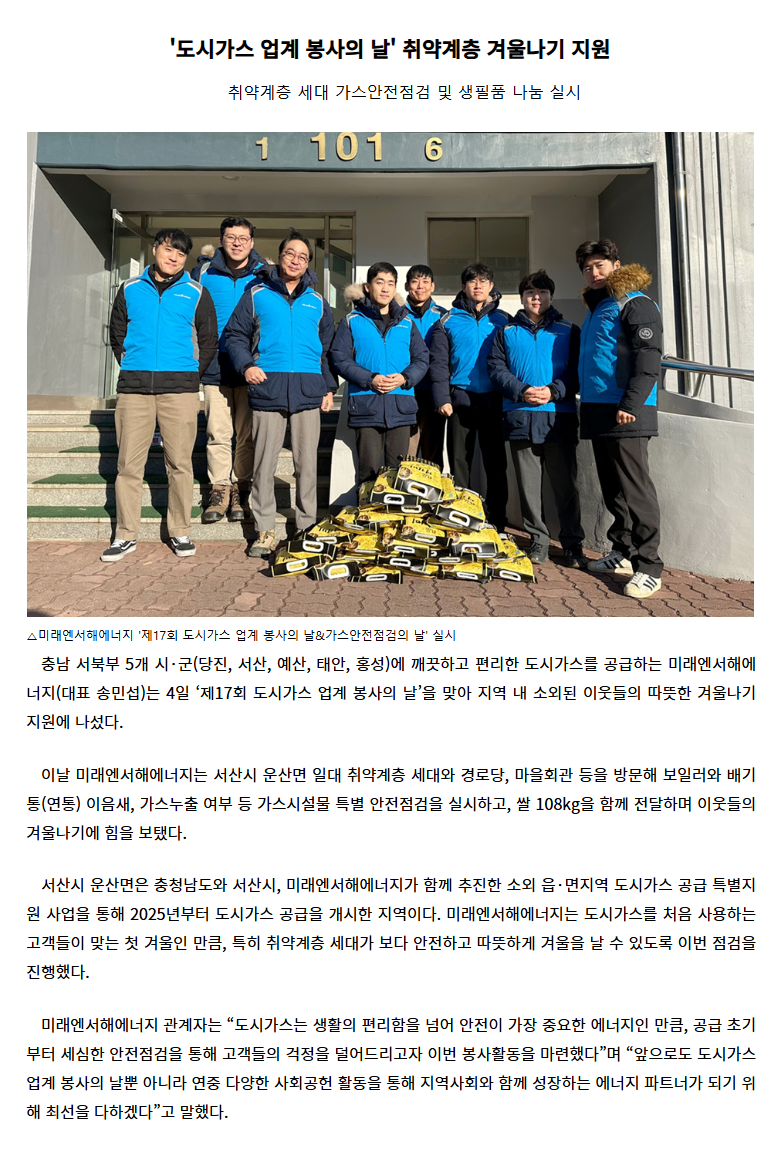 '도시가스 업계 봉사의 날' 취약계층 겨울나기 지원
