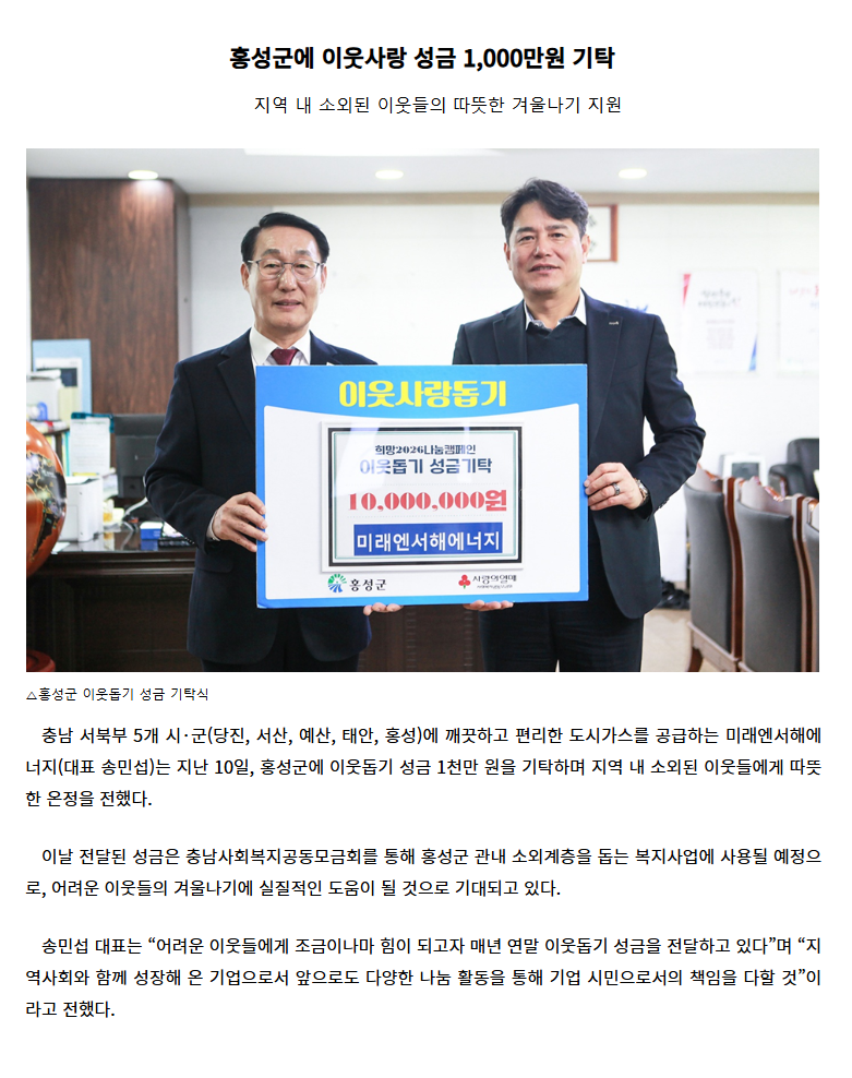 홍성군에 이웃사랑 성금 1,000만 원 기탁