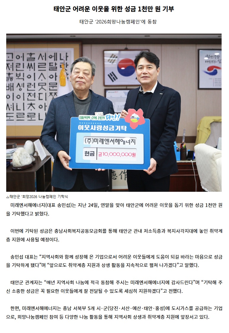 태안군 어려운 이웃을 위한 성금 1천만 원 기부